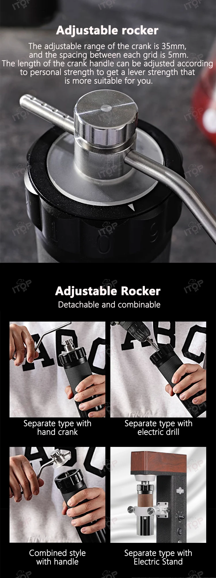 4. Adjustable rocker. The adjustable range of the crank is 35mm, and the spacing between each grid is 5mm. The length of the crank handle can be adjusted according to personal strength to get a lever strength that is more suitable for you.