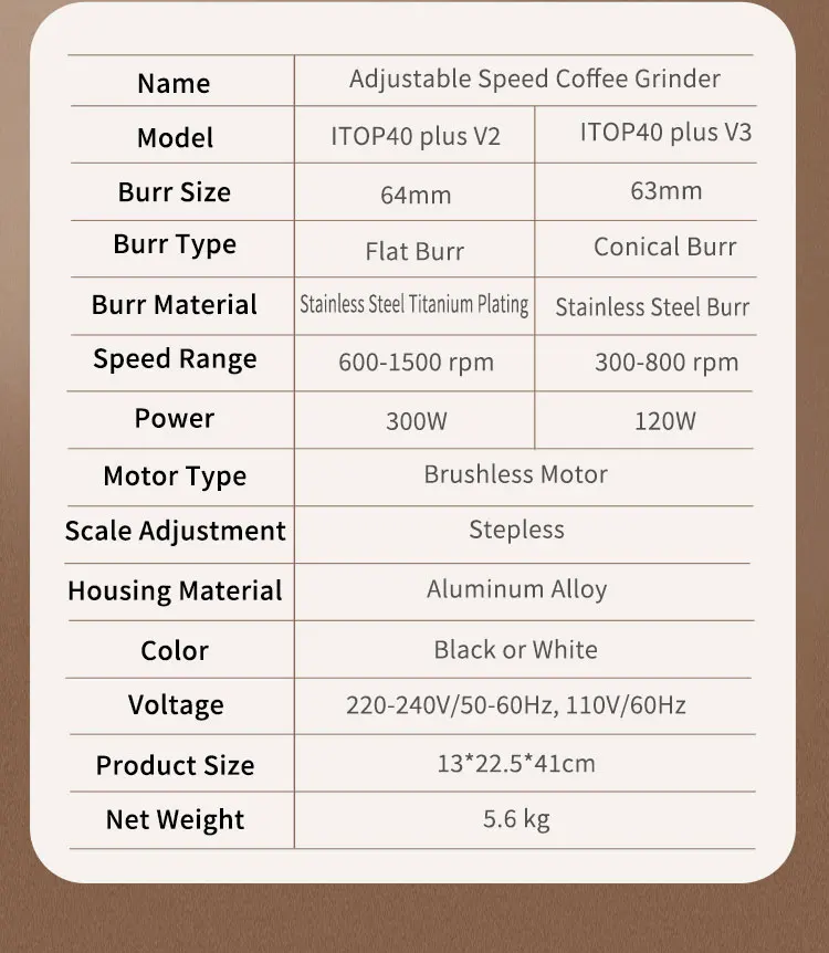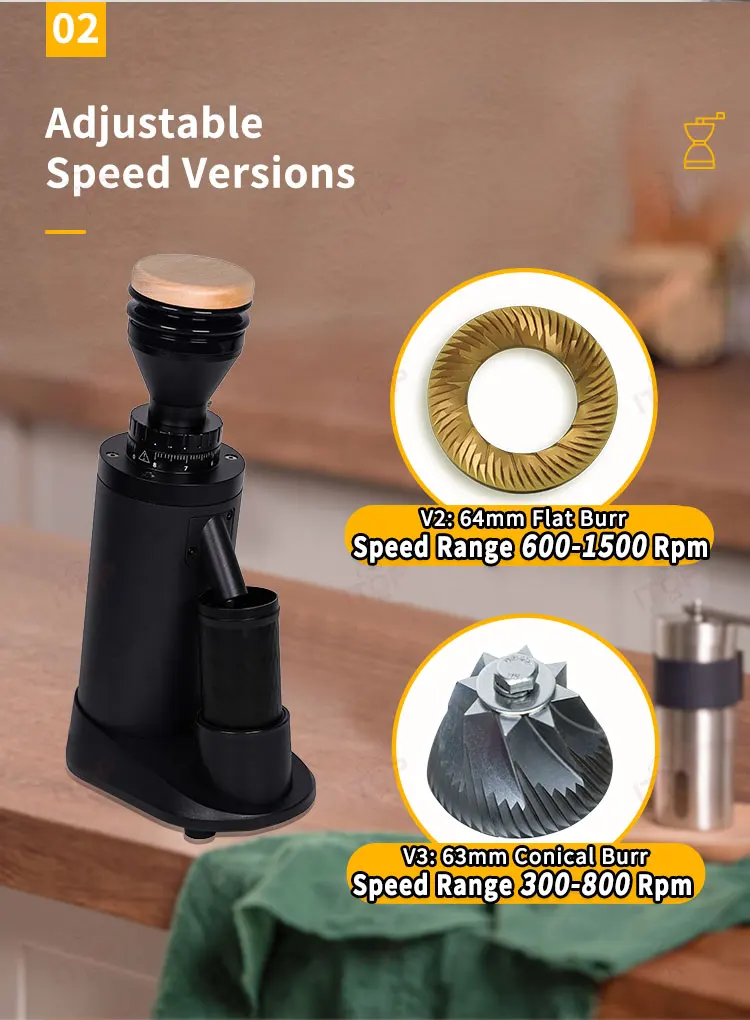 2.Adjustable Speed VersionsV2: 64mm flat burr, speed range 600-1500 rpmV3: 63mm Conical burr, speed range 300-800 rpm